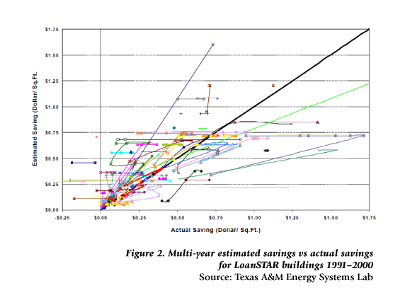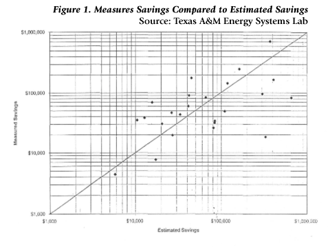 The answer turns out to be some of both. Audits, done under the LoanSTAR program by independent engineering consultants, were subject to TAMU standards but nevertheless problems in savings estimates were found in some 20 – 30% of cases reviewed. Such savings estimates were made subject to post-hoc adjustment, which is to say that new predictions were developed based on engineering analysis and used for comparison to actual results. But it was also found that systems were often not operating as intended and that performance could be improved by adjustment.