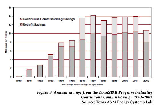 In the LoanSTAR program, commissioning was deployed in retrofit projects to improve their performance. With this success it became natural to wonder whether a commissioning approach could be applied to existing systems, without the retrofit. Thus, the Continuous Commissioning® experience led to emergence of the field of Existing Building Commissioning, Retro-Commissioning, and On-going Commissioning.[7]